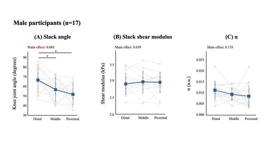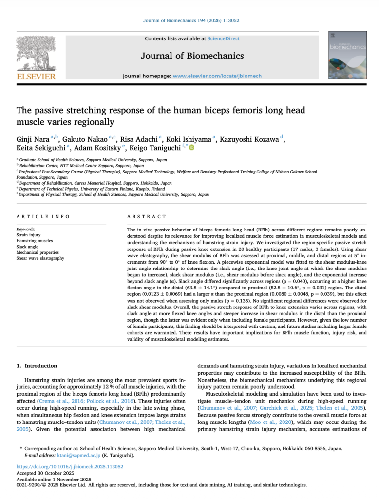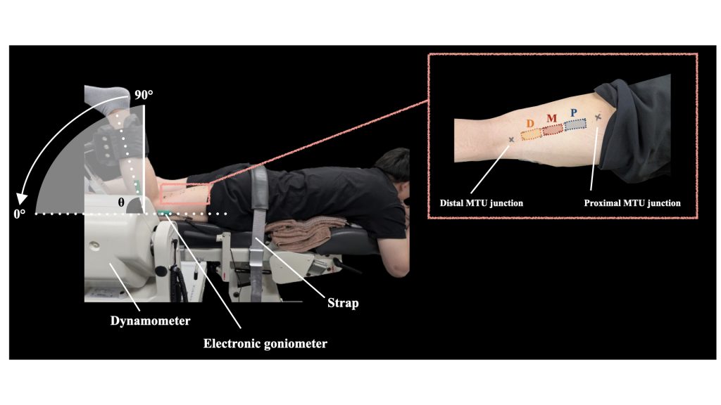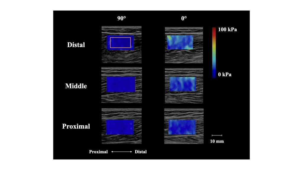 本研究では,他動膝関節伸展に伴う大腿二頭筋長頭の機械応答が部位によって異なるかを検討しました.その結果,遠位部では近位部に比べてより膝関節深屈曲位で受動張力が発生することを明らかとしました.これらは,大腿二頭筋長頭における部位特異的な損傷発生機序の理解や,正確な筋骨格モデリングの構築に寄与すると考えられます.