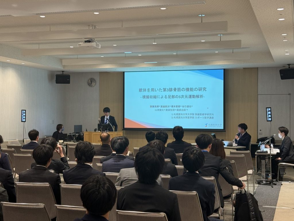 発表者:博士課程前期 齋藤高輝(指導教員:渡邉耕太) 表題:第3腓骨筋の足部運動機能 -献体を用いた3次元運動解析-
